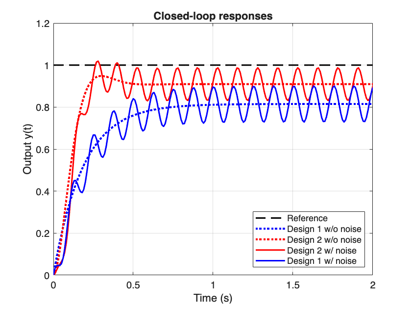 Fig. 38 Closed-loop step response for design 1 (\(F(s)=0.44\)) and design 2 (\(F(s) = \frac{\alpha}{s + \alpha}\)) with and without the noise \(n(t).\)#