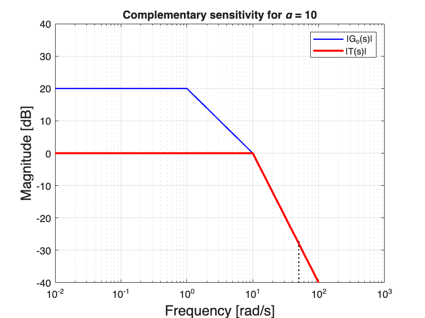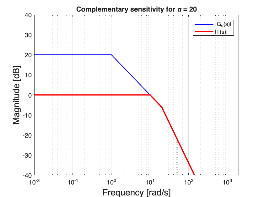 Let’s sart by observing that an attenuation factor of \(10\) corresponds to \(\lvert T(i 50) \lvert_{dB }= -20\) dB. From the sketch of complementary sensitivity for \(K=1\) in Fig. 34, we can note that