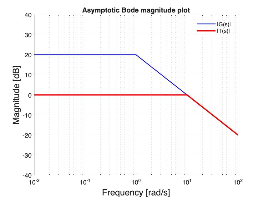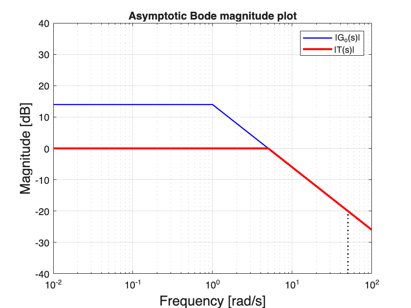 We can easily compute \(\lvert T(i 50) \lvert_{\text{dB}}\) using the sketching rule (14). Note that in this case we do have the Bode plot of \(\lvert G_o(i \omega) \lvert\): it is the same as the Bode plot og \(G(i \omega)\) because \(K=1\).